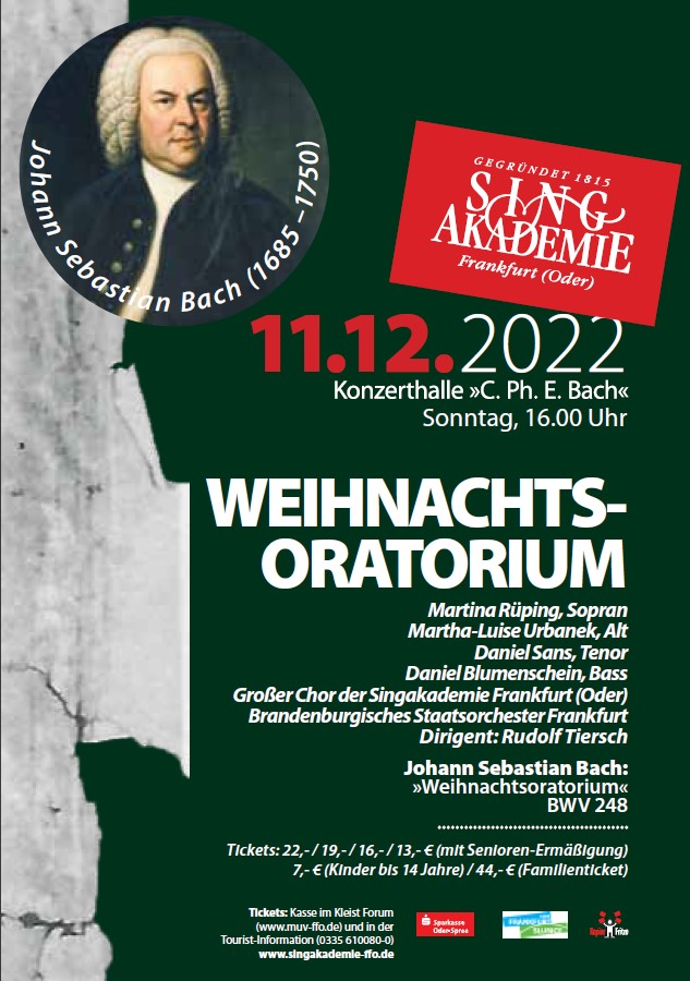 Zum 3. Advent, erstmalig nach den Corona-Jahren, erklang in der Konzerthalle das Weihnachtsoratorium. Das Brandenburgische Staatsorchester, Solisten und der Große Chor der Singakademie verbreiteten mit J.S. Bachs Weihnachtsoratorium wunderbare festliche Stimmung. Als alle Mitwirkenden den Saal betraten merkte man dies schon an dem Auftrittsapplaus.